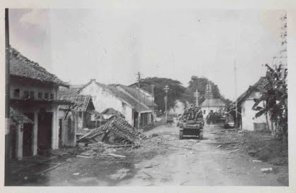 The three veterans whom we spoke, were not yet in Indonesia at the time of the cannonade on Candi, October 19, 1947. They arrived on March 31, 1948 and were assigned to a tank peloton of the 6th Escadron ("Vechtwagens"; fighting vehicles) of the KNIL-battaljon Infantry V, "Andjing Nica". J.F. was tankgunner. During the second military offensive on December 19, 1948 ("Operation Kraai") he drove from Gombong, through Keboemen to Poerworedjo. He couldn't remember that there was any fighting in Keboemen. See, however, the photograph below and a Youtube movie in which we see Ravie Ananda interviewing people that still remember how the Dutch army entered Keboemen: https://www.youtube.com/watch?v=GtQtughlifM